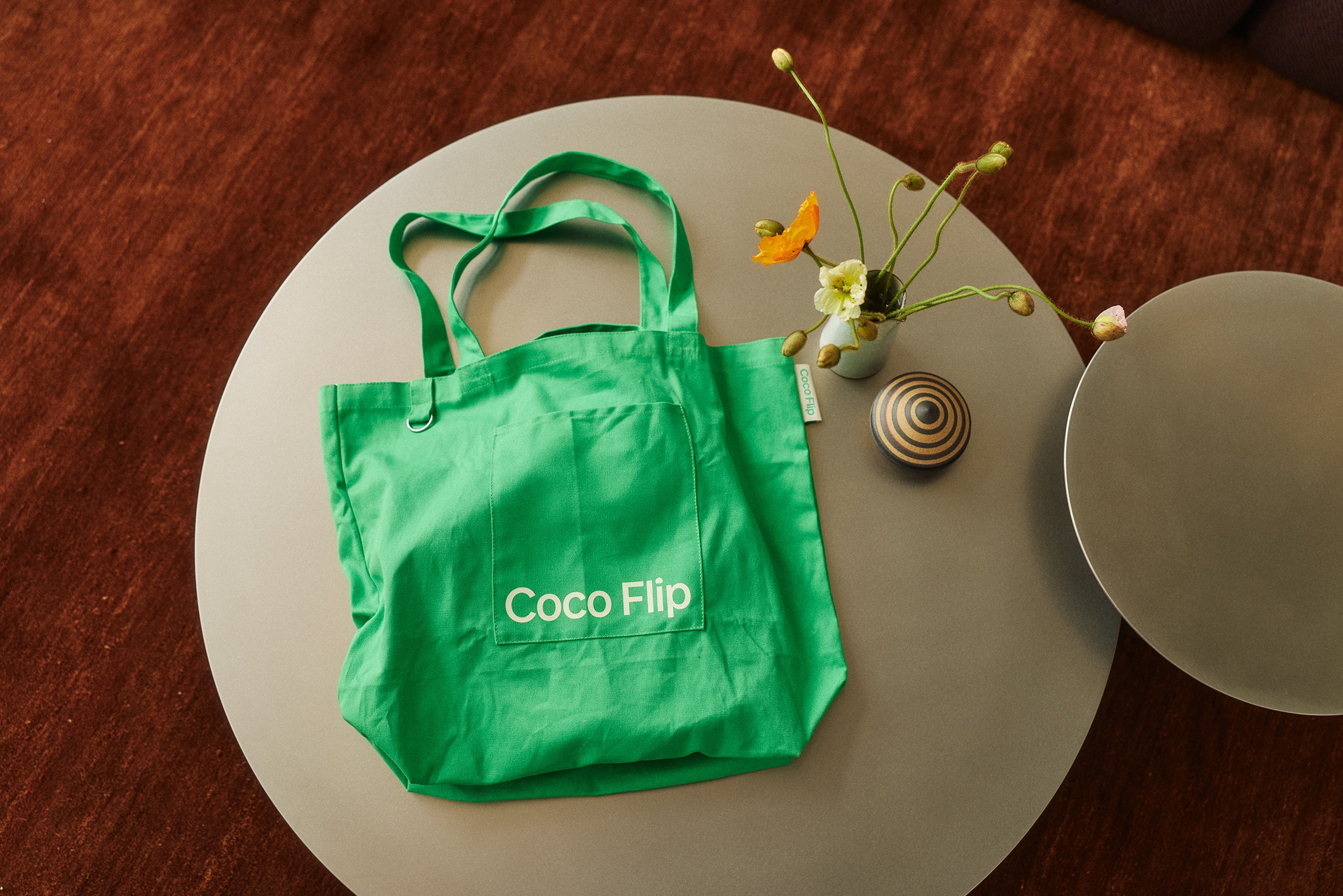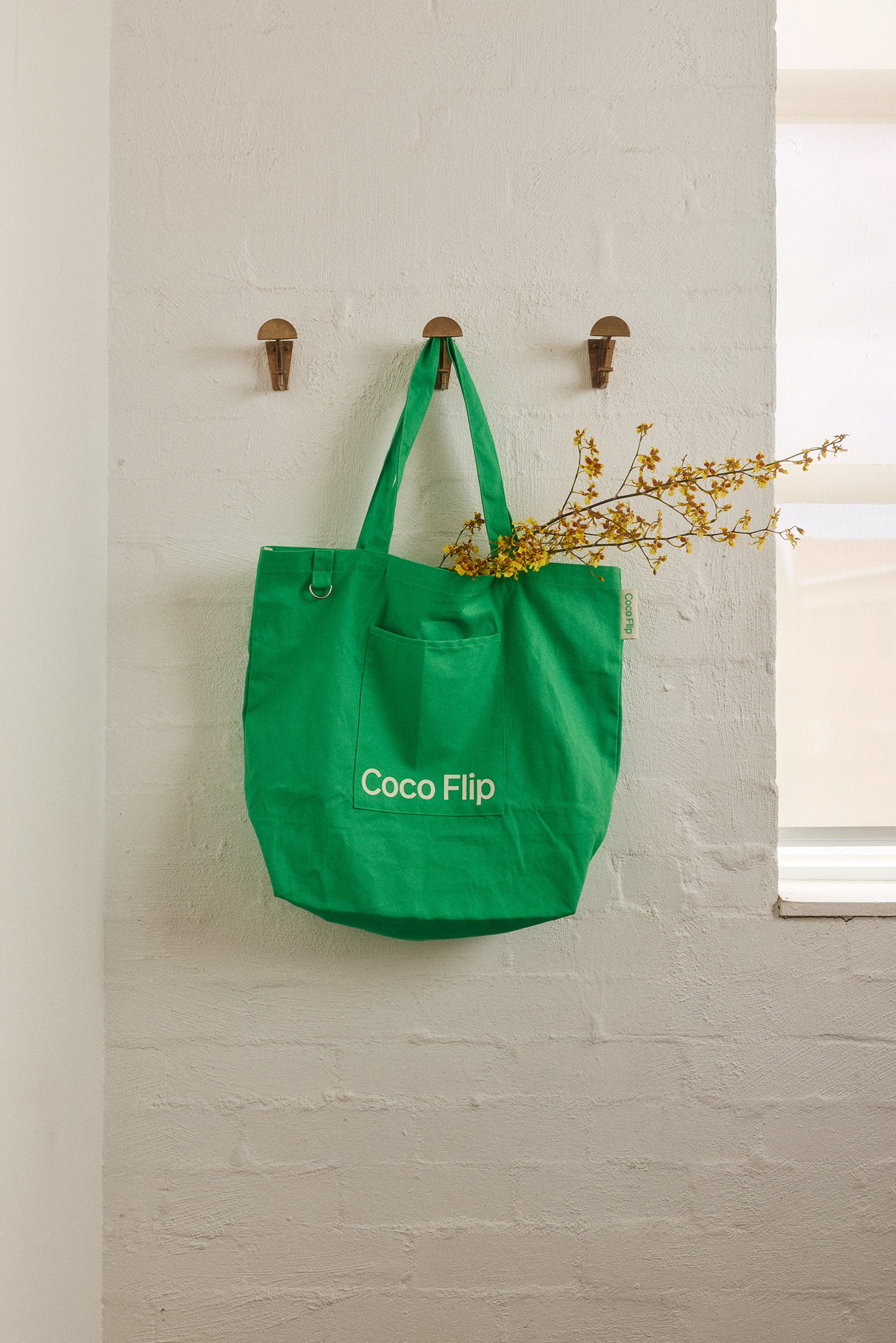 Created to celebrate Coco Flip’s 15-year anniversary, this limited-edition green tote is roomy, easy to carry, and ready for everyday outings. It includes long and short handles, an external pocket, a secure internal zip pocket, and a D-ring key loop. Finished with a playful illustration by Sam Phillips, it’s a reliable companion for market runs, beach days, and everything in between.